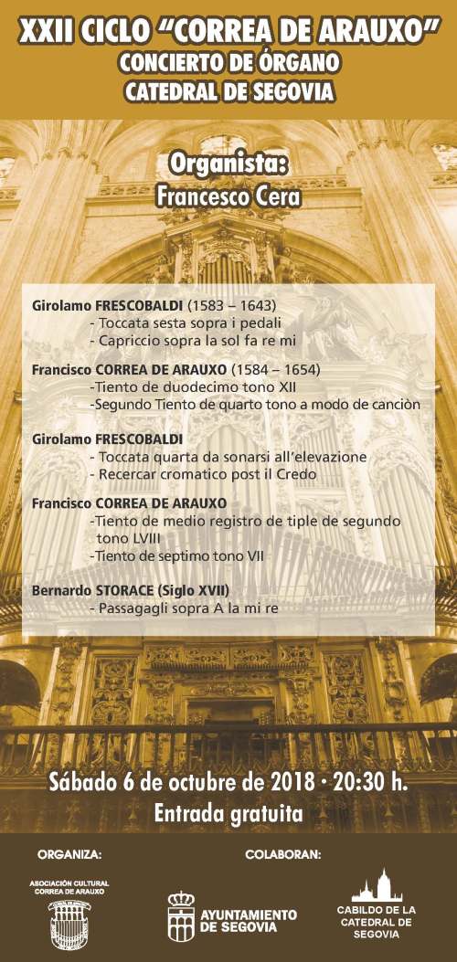 Francesco Cera ofrece un concierto de órgano el sábado 6 de octubre de 2018, a las 20:30 h. en la Catedral de Segovia, dentro del XII Ciclo organizado por la Asociación Correa de Arauxo.