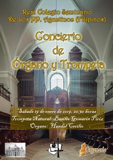 El sábado 19 de enero, a las 20:30 h., en la iglesia del Real Colegio Seminario de los P.P. Agustinos (Filipinos) de Valladolid, (Paseo de Filipinos, nº 7) tendrá lugar un Concierto de trompeta natural y órgano a cargo de los músicos Basilio Gomarín Píriz (trompeta) y Handel Cecilio (órganista).
