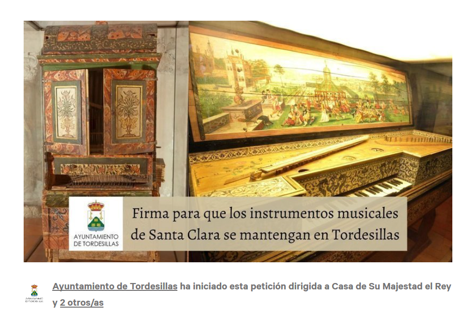 En una lucha fratricida de David contra Goliat y del mundo urbanita frente a lo rural, el Ayuntamiento de Tordesillas ha lanzado una recogida de firmas virtual para evitar que salga de la villa el realejo de Juana I y un virginal obra de Hans Bos de 1578 ubicados en el Real Monasterio de Santa Clara. La reivindicación, supone la primera de otras muchas […] para evitar que el patrimonio de la villa sea trasladado a la capital de España. “Esta medida sobre nuestro patrimonio tendría efectos negativos en el atractivo turístico de la comarca y por tanto en la lucha contra la despoblación, ya que el turismo representa un pilar fundamental de nuestra economía. Existen suficientes bienes procedentes de otros museos, de fondos no expuestos o de las colecciones actualmente expuestas en el Palacio Real de Madrid que pueden conformar la colección del futuro Museo de las Colecciones Reales ese Museo, sin necesidad de despojar a Tordesillas de su patrimonio.” apunta el alcalde del municipio Miguel Ángel Oliveira.