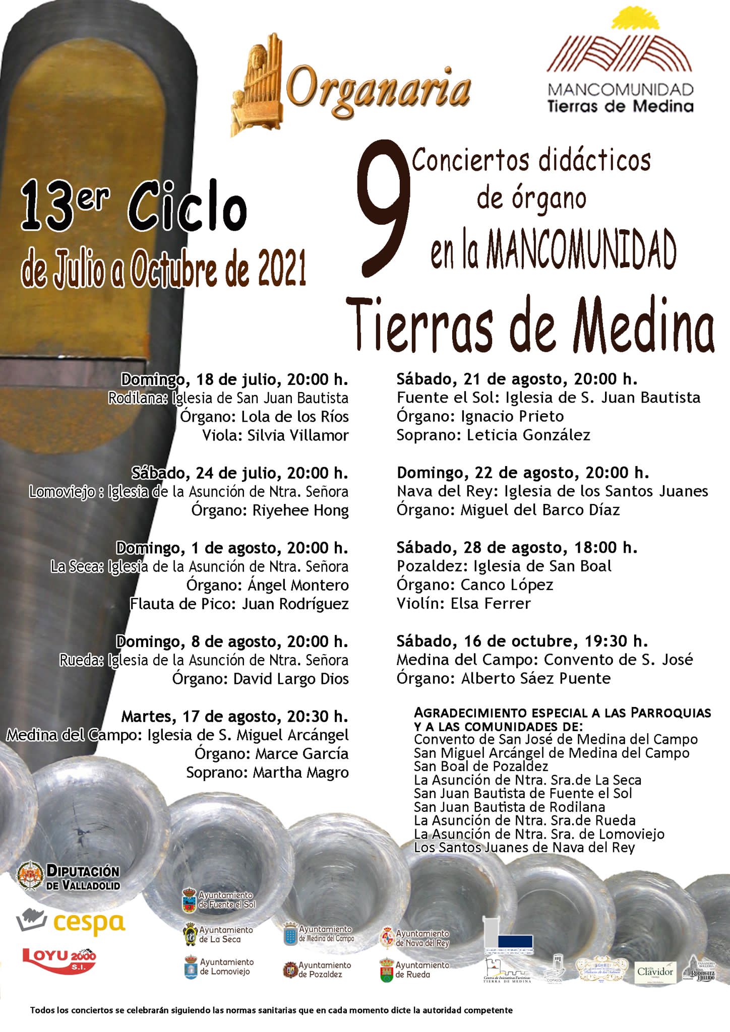 La asociación cultural ORGANARIA organiza, con la colaboración de la Mancomunidad Tierras de Medina (Valladolid), el 13º «Ciclo de Conciertos Didáctidos de Órgano» este año 2021, nueve conciertos de órgano que se celebrarán entre el 18 de julio y el 16 de octubre.