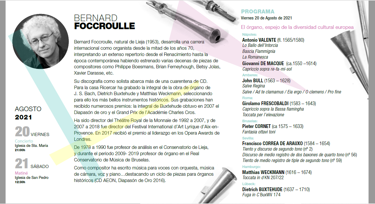 Bernard Foccroulle ofrece un concierto de órgano el viernes 20 de agosto de 2021, a las 21 h. en la Iglesia de Santa María de Tordesillas (Valladolid), organizado por la Asociación El Realejo.