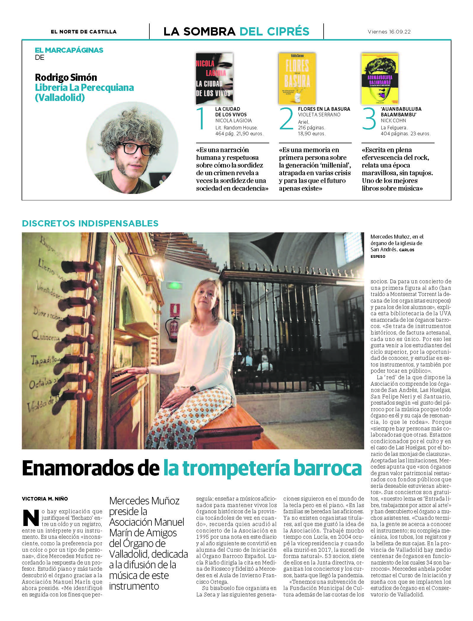 La periodista Victoria Martín Niño dedicaba su entrevista de la sección Discretos Indispensables, en el Suplemento La Sombra del Ciprés, del diario El Norte de Castilla, el dieciséis de septiembre de dos mil ventidós a la presidenta de la Asociación, Mercedes Muñoz Olmedo.