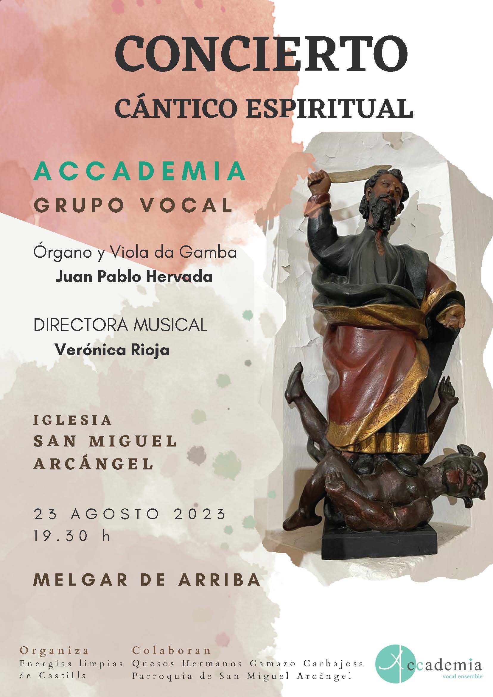 El miércoles 23 de agosto de 2023, a las 19:30 h, en Melgar de Arriba (Valladolid), el grupo vocal Accademia ofrecerá un concierto, acompañado al órgano y viola de gamba por Juan Pablo Hervada, bajo la dirección de Verónica Rioja.