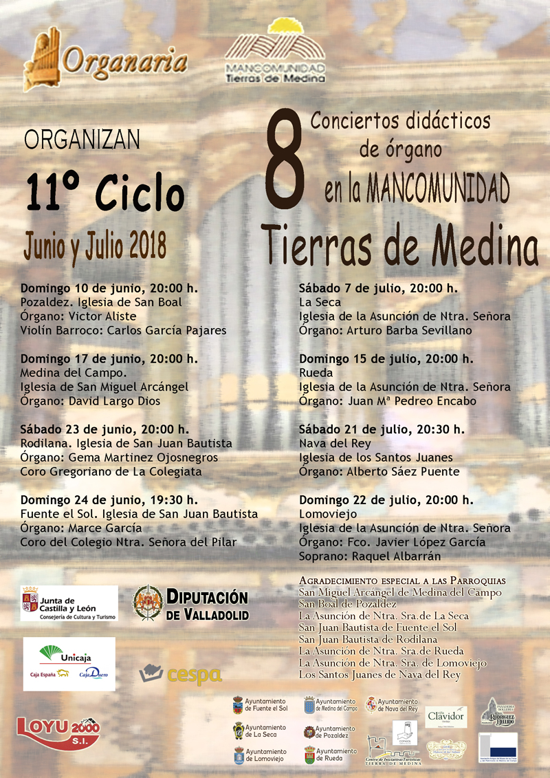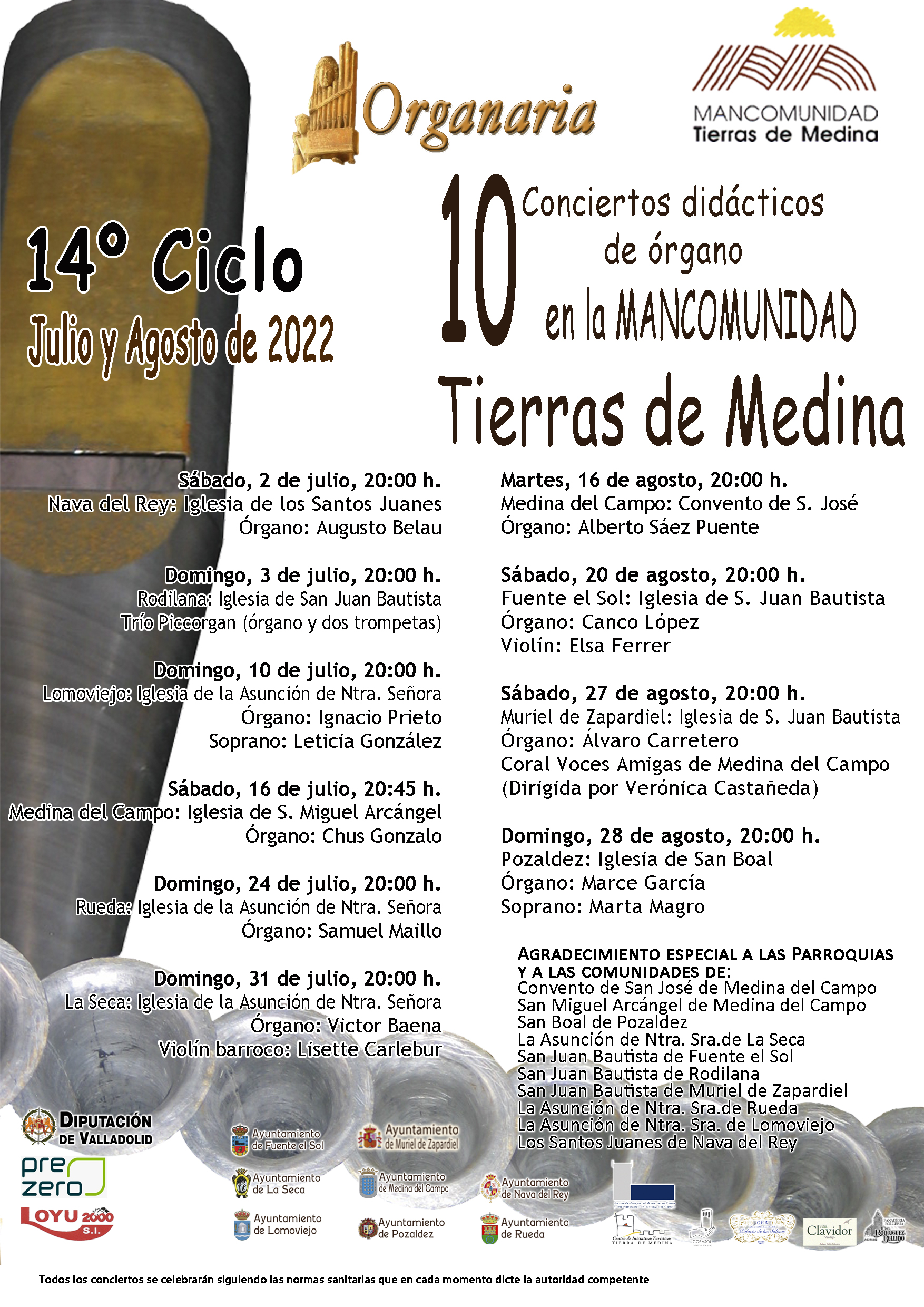 La Mancomunidad Tierras de Medina, y la Asociación Cultural ORGANARIA organizan el «VIII Ciclo de Conciertos de Órgano en la Mancomunidad Tierras de Medina». Tras el concierto, la Bodega Clavidor de La Seca y la Panadería «Rodríguez Bellido» de Pozaldez ofrecen pastas tradicionales de elaboración artesana y una copa de vino a los asistentes.