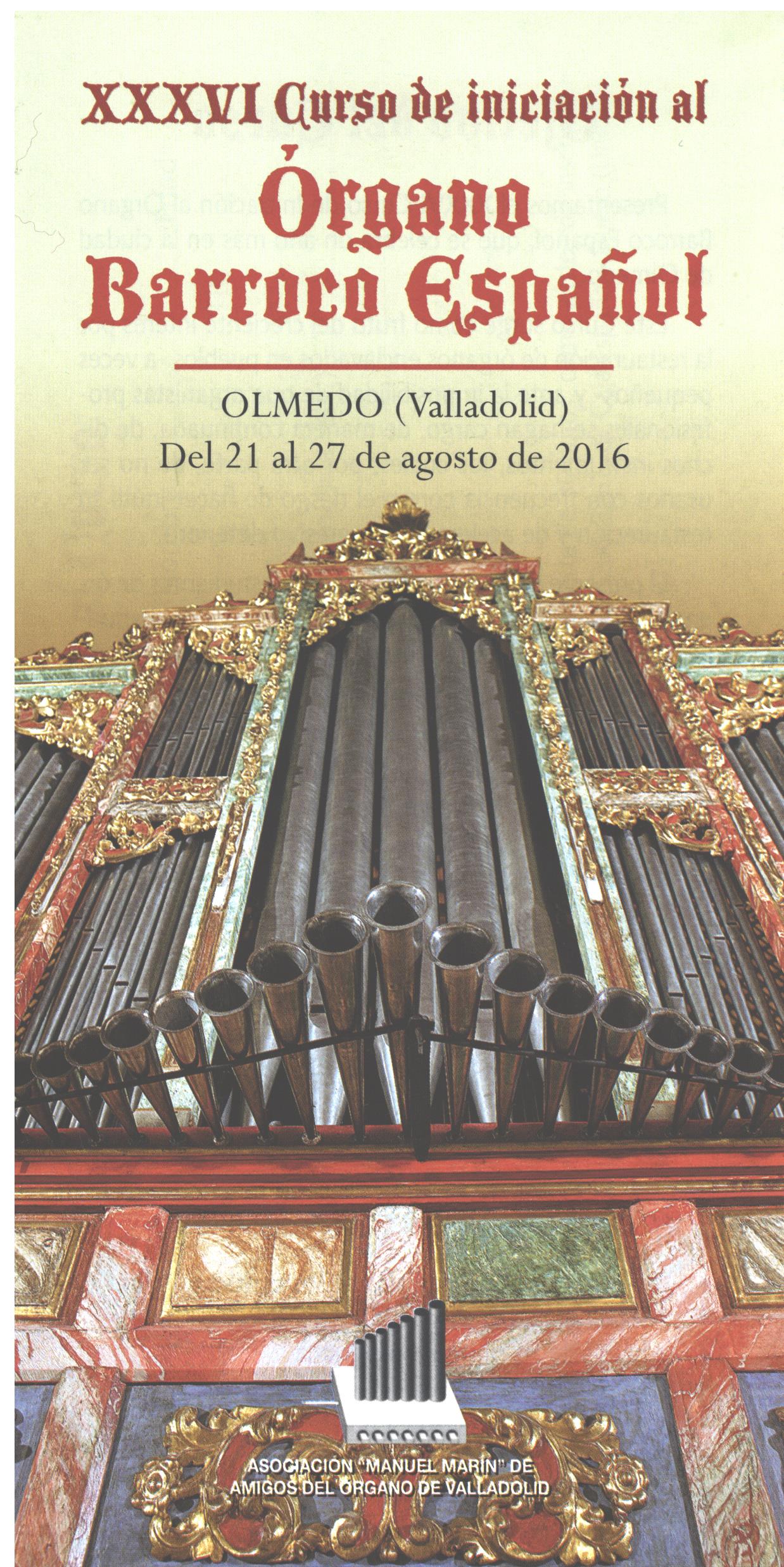 En la villa de Olmedo (Valladolid), patrocinado por el Excmo. Ayuntamiento de Olmedo, del 21 al 27 de agosto de 2016, va a celebrarse el “XXXVI Curso de Iniciación al Órgano Barroco Español”, organizado por la Asociación Manuel Marín de Amigos del Órgano de Valladolid.