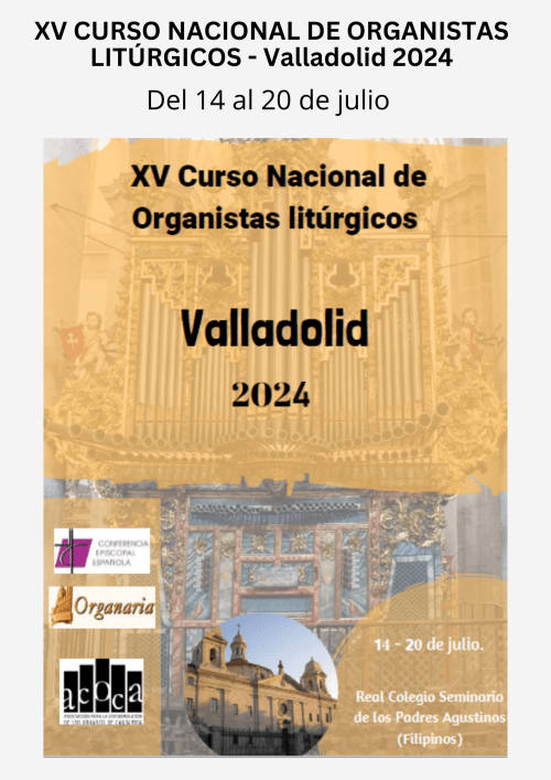 El XVI Curso Nacional de Organistas Litúrgicos va a celebrarse en Valladolid del 13 al 18 de julio de 2025, con las siguientes actividades de entrada libre: