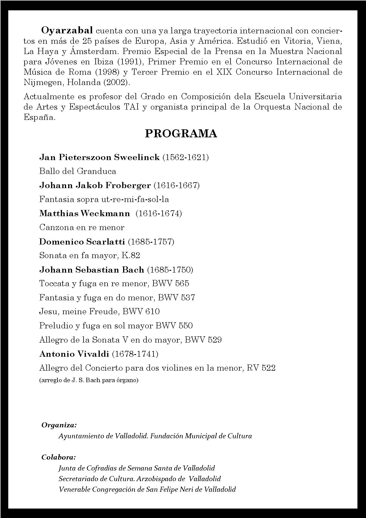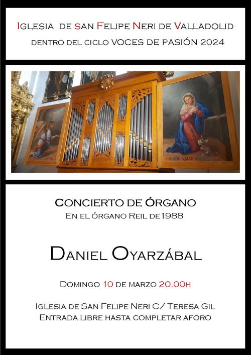 El domingo 10 de marzo de 2024, a las 20:00 h, el organista Daniel Oyarzábal ofrecerá un concierto en la Iglesia de San Felipe Neri de Valladolid, en el recién inaugurado órgano de la casa Reil (1988).
