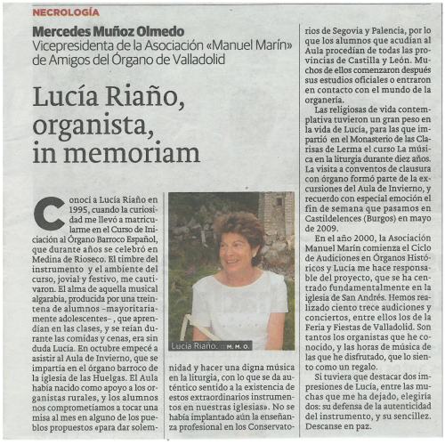 El 24 de febrero de 2018, a las 20:45 h., después de la misa de las 20h., que acompañó la organista Marce García Cuadrado, en la Iglesia de San Andrés de Valladolid, se celebró el Concierto de Órgano Homenaje a Lucía Riaño, a cargo de algunos de los alumnos que descubrieron el instrumento de su mano, con el siguiente programa: