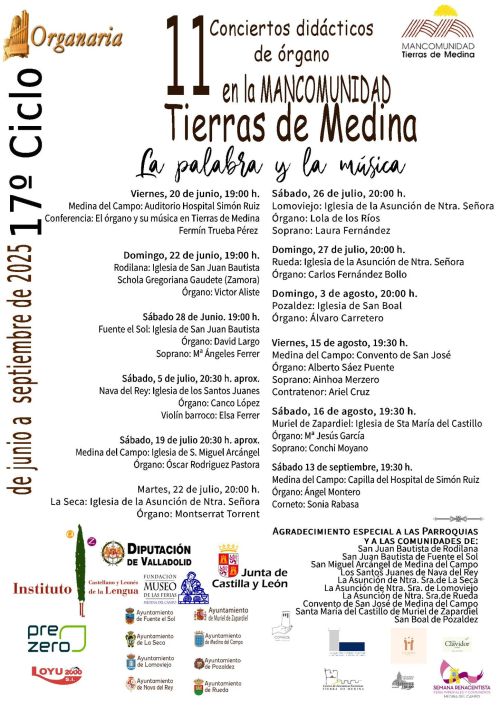 La Asociación cultural Organaria, con la colaboración de la Mancomunidad Tierras de Medina, organiza el 17º Ciclo de Conciertos Didácticos de Órgano en distintas localidades de esta mancomunidad de Valladolid, de junio a septiembre  de 2025.