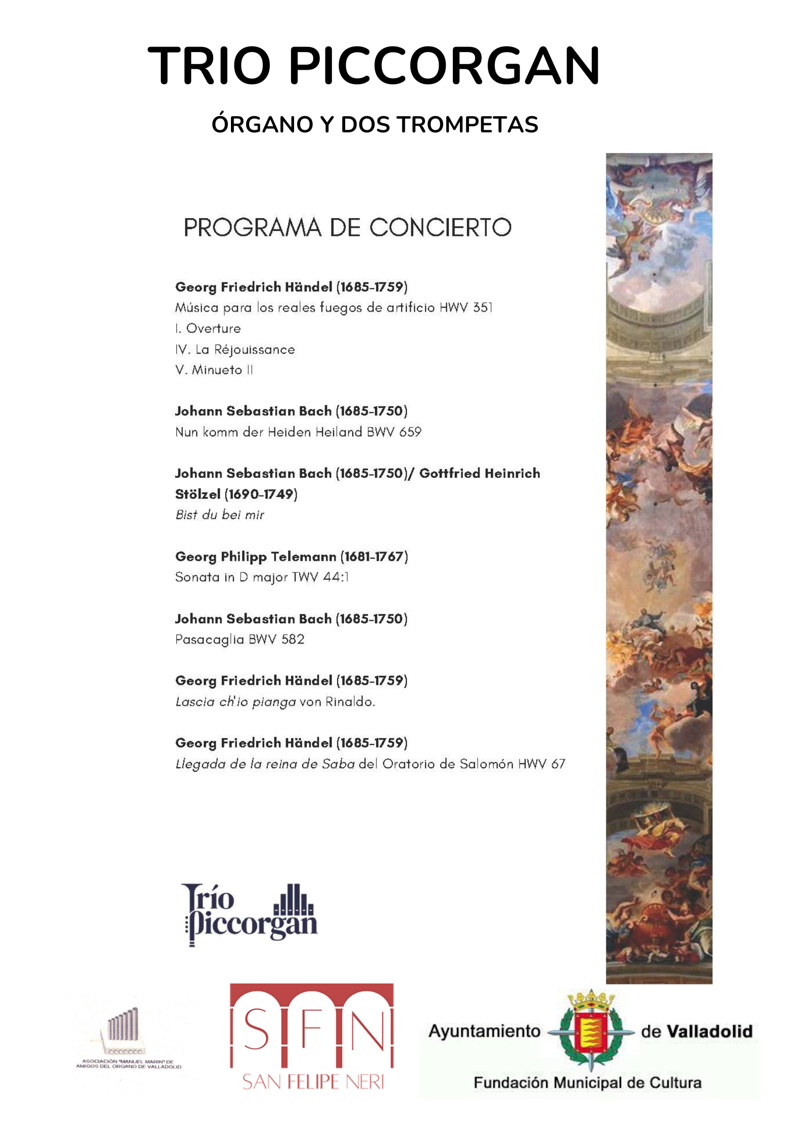 Trío Piccorgan: Miguel Conde y Diego García, trompetas; Daniel Cardiel, órgano. Obras: Händel, Bach y Telemann. Lugar: Iglesia de San Felipe de Neri. Organizan: Asociación «Manuel Marín» y Fundación Municipal de Cultura de Valladolid.