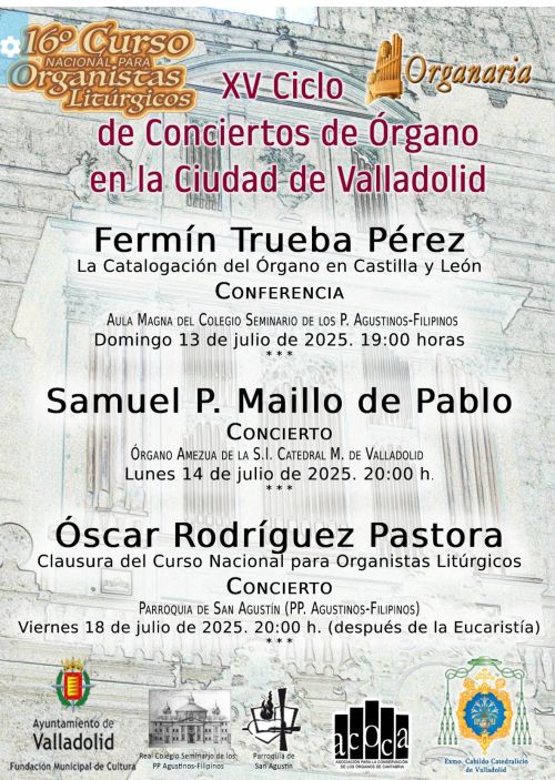 Organizan las asociaciones: Asociación Cultural Organaria, los correspondientes a los días 14, lunes y 18, viernes, dentro del Curso Nacional para Organistas Litúrgicos – conciertos de inauguración y clausura – y la Asociación «Manuel Marín» de Amigos del Órgano organiza el concierto del día 15 de julio, martes, en la Iglesia de Santiago.