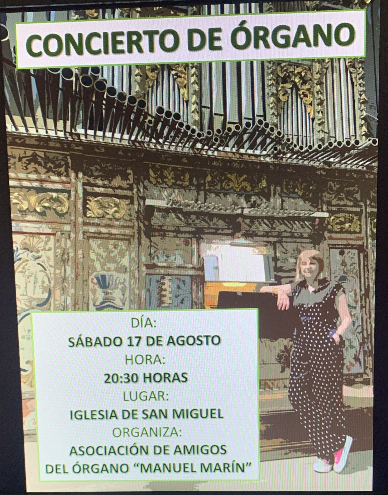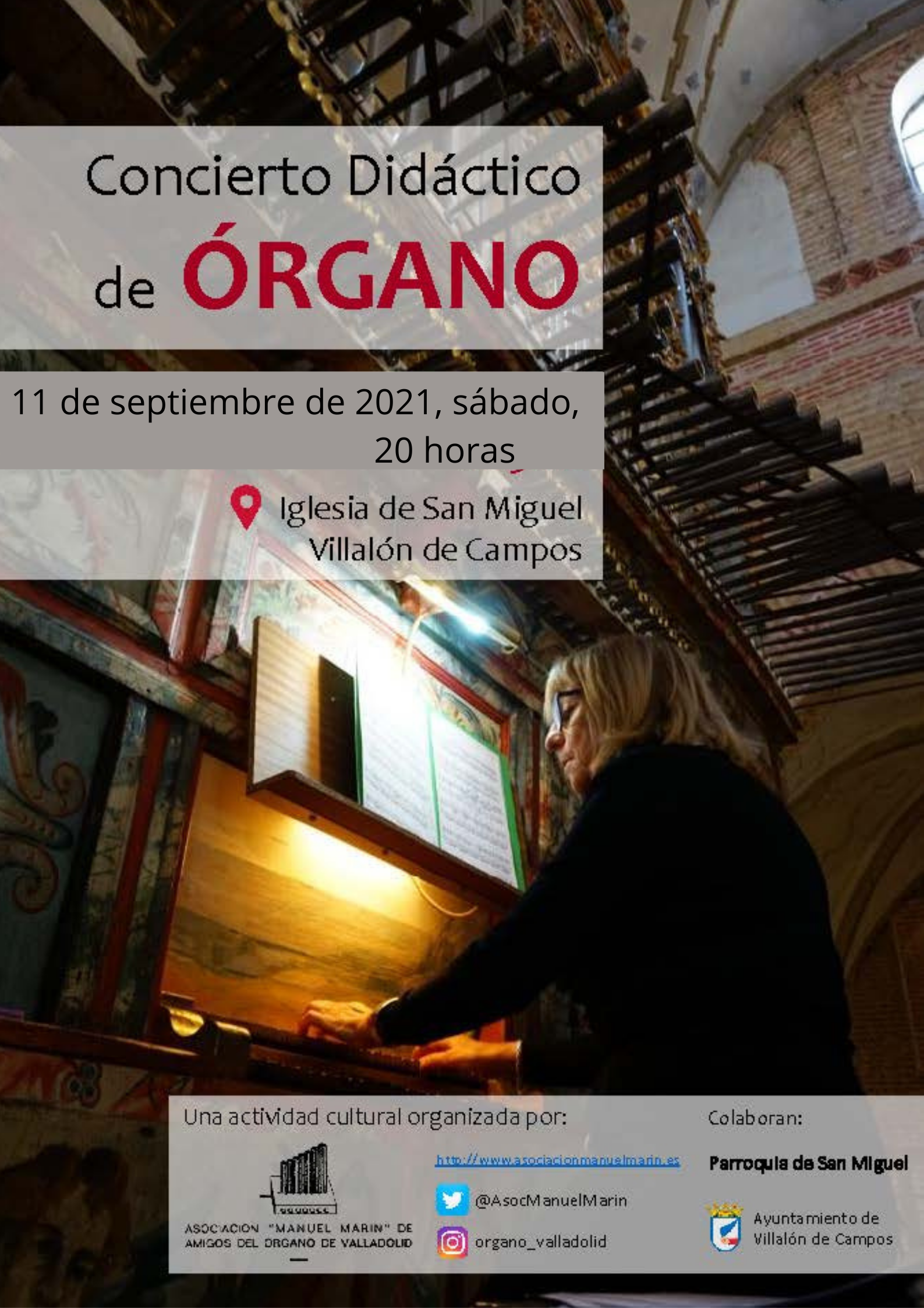 El domingo 18 de septiembre de 2022, a las 19 horas, en Villalón de Campos (Valladolid), tendrá lugar un concierto didáctico de órgano organizado por la Asociación «Manuel Marín» de Amigos del Órgano de Valladolid, a cargo de Marce García Cuadrado, David Herrero Calvo, y Mercedes Muñoz Olmedo, que interpretarán distintas obras en el magnífico órgano barroco de la Iglesia de San Miguel Arcángel de esta localidad.